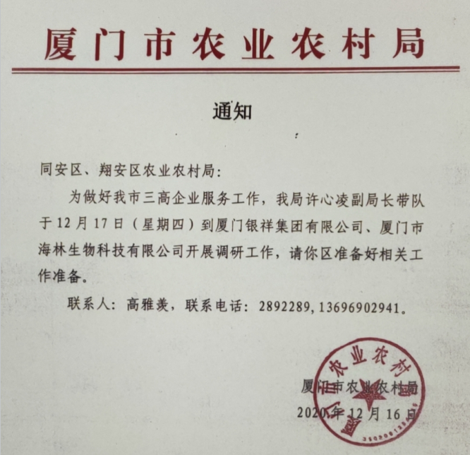 廈門市農(nóng)業(yè)農(nóng)村局蒞臨廈門市海林生物科技有限公司開展三高企業(yè)服務調(diào)研工作